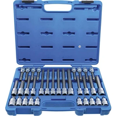 made of chrome vanadium steel knurled with flat flanks compared to standard T-Star (for Torx) for Torx-Plus screws with pin scope of delivery: 10 bit sockets TPS20 - TPS25 - TPS27 - TPS30 - TPS40 - TPS45 - TPS50 - TPS55 - TPS60 - TPS70, length: 55 mm, tamperproof | 10 bit sockets TPS20 - TPS25 - TPS27 - TPS30 - TPS40 - TPS45 - TPS50 - TPS55 - TPS60 - TPS70, length: 100 mm, tamperproof | 6 bit sockets TPS40 - TPS45 - TPS50 - TPS55 - TPS60 - TPS70, length: 140 mm, tamperproof | 6 bit sockets TPS40- TPS45 - TPS50 - TPS55 - TPS60 - TPS70, length: 200 mm, tamperproof, Manufacturer: BGS