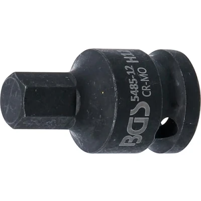 made of chrome molybdenum steel for both manual and impact wrenches | can be fixed on impact wrench by pin and O-ring output profile: internal hexagon | output profile size: 12 mm max. torque: 444 Nm | length: 42 mm drive profile: internal square | drive profile size, inch: 1/2 " | drive profile size, metric: 12,5 mm, Manufacturer: BGS