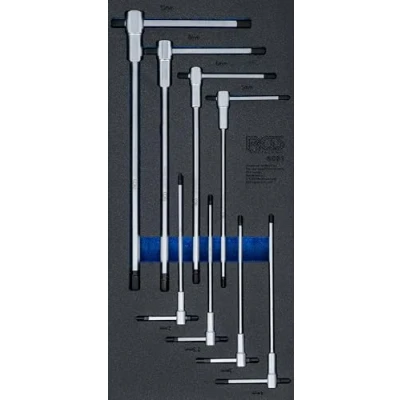 High-quality finish for use in workshops and industry | for 2 - 10 mm hexagon screw heads | outlet on three ends Can be screwed in hard-to-reach places | can be used with short and long blades depending on screwing application | with material and size identification Sliding blade with safety pin | Heavy duty sturdy foam tool tray | Tools are protected in the hard foam insert and stored in the gaps to prevent slippage Each individual tool has its corresponding place | suitable for all BGS tool trolleys | output: hexagon inside | material: chrome vanadium steel Box contents: 1 x T-handle screwdriver, hexagon inside, 2 mm | 1 x T-handle screwdriver, hexagon inside, 2.5 mm, 1 x T-handle screwdriver, inner hexagon, 3 mm, 1 x T-handle screwdriver, inner hexagon, 3 mm, 1 x T-handle screwdriver, inner hexagon, 4 mm. | 1 x screwdriver with Sliding T-handle, hexagon inside, 5 mm | 1 x T-handle screwdriver, 6 mm hexagon, 1 x T-handle screwdriver, internal hexagon, 8 mm | 1 x T-handle screwdriver, inner hexagon, 10 mm, Weight: 2.67420723806 pounds, Manufacturer: BGS