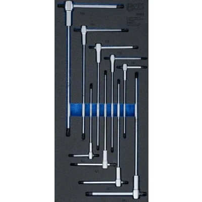 finished to a high-grade for use in handicraft business and for industrial use - for T-Star (for Torx) screw heads from T10 up to T50 - output profile at three points allows screwing in hard-to-reach areas - can be used with short and long blades, depending on the screwing application - with material and size marking sliding blade with locking pin - tool tray made from high-resistance foam - the tools are protected in the hard foam tray and are stowed in the recesses in a non-slip manner each individual tool has it's appropriate place - suitable for all BGS workshop trolleys - output profile: T-Star (for Torx) - material: chrome vanadium steel, Weight: 2.5683853523 pounds, Manufacturer: BGS