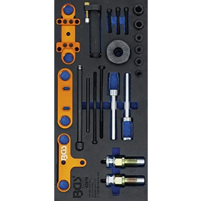 for dismantling and assembling injection nozzles on BMW and Mercedes-Benz petrol injection engines required when renewing the injector seals and injectors width: 209 mm | height: 67 mm | depth: 446 mm suitable for the following vehicles: BMW models: 135is (2008-), 335 (2007-), 335xi (2007-), 535i (2008-), 535xi (2008-), 550i GT (2010-), 750Li (2009-), 750i (2009-), X3 3.0i (2007-), X5 (2011-), X5 3.0i (2008-), X6 (2008-), engines: N14 / N18 / N20 / N47 / N54 / N57 / N55 / N63 | Mercedes-Benz models: C-class (2007-), CLK / SLK (2007-), E-class (2007-), A / CLA / GLA 45 AMG (2013-), CL / CLS 63 AMG (2010-), E / G / GL 63 AMG (2011-), GLE 63 AMG (2015-), S / SL 63 AMG (2010-), SLK 55 AMG (2012-), engines: M133 / M152 / M157 / M270 / M271 / M274 / M276 / M278 scope of delivery: petrol injector tool, to be used as BMW OEM 130320 | petrol injector tool, to be used as BMW OEM 130270 | petrol injector tool, to be used as BMW OEM 2249115 | petrol injector tool, to be used as BMW OEM 130180 | seal ring mounting tool, Ø 10.5 / 12.5 mm, to be used as BMW OEM 130195 | petrol injector pulling claw, to be used as Mercedes-Benz OEM 271589023300 | petrol injector pulling claw, to be used as Mercedes-Benz OEM 278589003300 | spacer sleeves, 4 pieces | slide hammer, Manufacturer: BGS