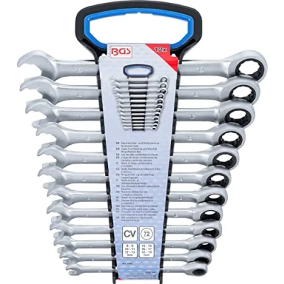 extensive ratchet ring combination wrench set with all commercially available sizes | made of high-quality chrome vanadium steel for long service life and durability | universally applicable for working and counterholding on screw connections ratchet function facilitates work on heavy-duty screws and ensures optimum power transmission | open end side with new ratchet mechanism | screws can also be operated on the jaw side without having to be reattached suitable for left- and right-hand tightening | neatly stowed in a practical holder with separate slot for each key | with non-slip surface, for a strong grip even in oily or wet working situations | fine toothed with 72 teeth | metric version output profile ring side: 12 pt. | material: chrome vanadium steel | actuation angle: 5° | head offset: 15° | surface finish: satin chrome plated | number of teeth in ratchet head: 72 scope of delivery: 1 open end ratchet and ratchet ring wrench: 8 mm, length 142 mm - 9 mm, length 152 mm - 10 mm, length 162 mm - 11 mm, length 172 mm - 12 mm, length 176 mm - 13 mm, length 182 mm - 14 mm, length 192 mm - 15 mm, length 202 mm - 16 mm, length 208 mm - 17 mm, length 227 mm - 18 mm, length 238 mm - 19 mm, length 246 mm, Weight: 3.73463071828 Pounds, Manufacturer: BGS