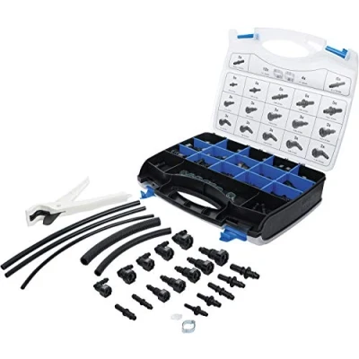 for replacing and repairing of plastic pipes and connectors | contains plastic pipes, rubber hoses, connectors and couplings in straight and angled design in different diameters suitable for fuel and vacuum piping and fuel vapor retention systems (EVAP) | universal by suitable for a variety of vehicle models | enables an effective, professional repair adequate to the OEM product scope of delivery:1 cutting pliers with stainless steel blade for shortening the plastic pipes andamp; rubber hoses | 3 angled female pipe connectors 6.3 x 6 mm | 3 angled female pipe connectors 7.89 x 8 mm | 3 angled female pipe connectors 9.49 x 8 mm | 3 angled female pipe connectors 9.89 x 8 mm | 3 angled female pipe connectors 11.80 x 10 mm | 3 straight female pipe connectors 6.3 x 6 mm | 3 straight female pipe connectors 7.89 x 8 mm | 3 straight female pipe connectors 9.49 x 8 mm | 3 straight female pipe connectors 9.89 x 8 mm | 3 straight female pipe connectors 11.8 x 10 mm 5 straight male pipe connectors 6.3 x 6 mm | 5 straight male pipe connectors 7.89 x 8 mm | 5 straight male pipe connectors 9.49 x 8 mm | 5 straight male pipe connectors 9.89 x 8 mm | 5 straight male pipe connectors 11.8 x 10 mm 3 plastic pipe to rubber hose connectors (6 mm plastic pipe to 7.5 mm rubber hose) | 6 plastic pipe to rubber hose connectors (8 mm plastic pipe to 7.5 mm rubber hose) | 2 plastic pipes (nylon) 6 x 340 mm | 6 plastic pipes (nylon) 8 x 340 mm | 2 plastic pipes (nylon) 9.5 x 340 mm | 3 rubber hoses 7.5 x 200 mm | 1 rubber hoses 12 x 200 mm | 12 hose clips 15 - 18 mm | 4 hose clips 17 - 20 mm