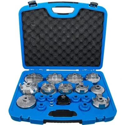 ideally suitable for installing and removing difficult to access oil filter cover when changing the oil filter insert or oil filter | for torque-precise tightening according to the manufacturer's instructions | suitable for left and right hand operation for manual operation scope of delivery: oil filter wrench 100.5 mm x 15-pt, for Mazda, Mitsubishi | oil filter wrench 94.5 mm x 15-pt, for Nissan, Toyota | oil filter wrench 92 mm x 15-pt, for Nissan, Subaru | oil filter wrench 79 mm x 15-pt, for Toyota, Honda, Mitsubishi, Subaru, Mazda, Isuzu | oil filter wrench 87 mm x 16-pt, for Volvo oil filter wrench 79.5 mm x 14-pt, for Lexus | oil filter wrench 70 mm x 14-pt, for Toyota | oil filter wrench 63 - 64 mm x 14-pt, for Toyota | oil filter wrench 66.5 mm x 14-pt, for Ford, Mazda oil filter wrench 84 mm x 14-pt, for Dodge Sprinter (2007-), Mercedes-Benz E320 (2007-), Jeep Cherokee 3.0L V6 Common Rail (2007-) | oil filter wrench 74 mm x 14-pt, for Mercedes-Benz | oil filter wrench 24 mm x 6-pt, for BMW 5, BMW 7, BMW X5 V8 (N62) (2004-), Saturn (2008), Astra 1.8L EcoTec, Chrysler 3.6L V6 (2011-), 200, 300, T/C Dodge Jeep | oil filter wrench 27 mm x 6-pt, for Mercedes-Benz A Class | oil filter wrench 30 mm x 6-pt, for Audi A2, VW Polo, Lupo 1.4L / 1.6L oil filter wrench 32.5 mm x 6-pt, for Opel Astra G, Corsa B, Zafira, Audi, VW 1-36 mm, Opel Omega, Vectra B, Zafira (98-), BMW M43/60 | oil filter wrench 36 mm x 6-pt, for Opel Omega, Vectra B, Zafira (98-), BMW M43/60, Mercedes-Benz Vito CDI, C, E, VW Lupo 1.2 TDI, MAN | oil filter wrench 38 mm x 6-pt, for Opel Vectra 2.0D | oil filter wrench, adjustable, 55 - 90 mm, universal | adaptor 12.5 (1/2") inner square to 10 (3/8") outer square