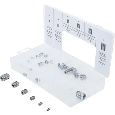 for repairing and reducing existing threads the inserts cut their own thread when screwing into a receiving hole absolutely secure and firm anchoring in the recording material scope of delivery: 10 thread inserts, internal screw thread M3 x 0.5, external screw thread M5 x 0.6, length: 6 mm (10 pcs.) | 8 thread inserts, internal screw thread M4 x 0.7, external screw thread M6.5 x 0.8, length: 8 mm (8 pcs.) | 6 thread inserts, internal screw thread M5 x 0.8, external screw thread M8 x 1.0, length: 10 mm (6 pcs.) | 4 thread inserts, internal screw thread M6 x 1.0, external screw thread M10 x 1.25, length: 12 mm (4 pcs.) | 2 thread inserts, internal screw thread M8 x 1.25, external screw thread M12 x 1.5, length: 14 mm (2 pcs.) | 2 thread inserts, internal screw thread M10 x 1.5, external screw thread M14 x 1.5, length: 18 mm (2 pcs.), Weight: 0.1763698096 pounds, Manufacturer: BGS technic