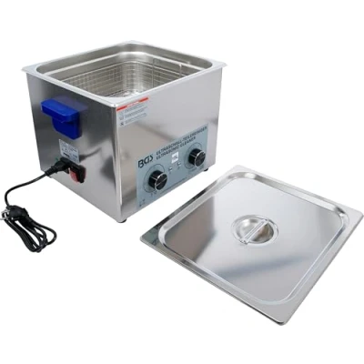 suitable for cleaning engine parts, tools, jewelry, watch straps, electrical components, toner cartridges, coins, etc. stainless steel housing, tank, lid and cleaning basket dimensions: 360 x 330 x 310 mm | tank size: 330 x 300 x 150 mm | tank capacity: 15 liter ultrasonic power: 360 watt | heating power: 400 watt | time setting: 0 - 20 min | temperature setting: 20 - 80 °C | ultrasonic frequency: 40 KHz | mains supply: 230V / 50Hz, Weight: 19.0038469844 Pounds, Manufacturer: BGS