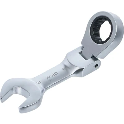 made of chrome vanadium steel ratchet is continiously adjustable up to 90° offset fine 72 tooth wrench size 1: 15 mm | wrench size 2: 15 mm length: 120 mm profile: 12-point surface finish: satin chrome plated, Manufacturer: BGS