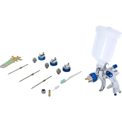 especially suitable for smaller areas and hard-to-reach places | professional working in the low pressure range | up to 30% savings on paint material due to HVLP technology | also suitable for all modern water-based paints stepless air and volume regulation enables precise and uniform application to achieve optimal painting results optimized center of gravity allows fatigue-free working with highest ergonomics | nozzles made of stainless steel | ergonomic handle contour fits perfectly in the hand | robust and durable working pressure: 2.0 - 3.5 bar (90 PSI) | air consumption: 410 l/min | compressed air connection: 1/4" | ink volume at 1.4 mm nozzle: 200 ml/min | ink volume at 1.7 mm nozzle: 300 ml/min | ink volume with 2.0 mm nozzle: 450 ml/min scope of delivery: 1 paint spray gun with plastic cup (600 ml) | 3 nozzle sets, complete (nozzle, nozzle needle and mouthpiece), sizes 1.4 - 1.7 - 2.0 mm | 1 cleaning brush | 1 assembling wrench, Weight: 2.65216101186 Pounds, Manufacturer: BGS