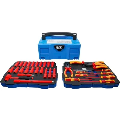perfect tool combination for use in the range of electrical installations or for repair and maintenance work on hybrid and electric vehicles | equipped with insulated tools and tested according to DIN EN/IEC 60900 | VDE insulated up to 1000 V | intelligent transport and storage system | one-handed operation: close, open and connect to other systainers | made of stable ABS plastic | functional handle and T-Loc closure this case is part of a multi-component system, stackable (containers can be locked to another and carried) | protective padding in the upper lid | inside dimensions: width 383 mm | height 127.5 mm | depth 267 mm | splash-proof | tool trays made from high-resistance foam | the tools are protected in the hard foam tray and are stowed in the recesses in a non-slip manner | each individual tool has its appropriate place | material: chrome vanadium steel scope of delivery: 1 VDE Screwdriver slot SL: 3 mm, blade length 75 mm (BGS 4925) - 4 mm, blade length 100 mm (BGS 4924) - 5.5 mm, blade length 125 mm (BGS 4940) - 6.5 mm, blade length 150 mm (BGS 4941) | 1 VDE Screwdriver, cross slot: PH0, blade length 75 mm (BGS 4942) - PH1, blade length 80 mm (BGS 4926) - PH2, blade length 100 mm (BGS 4927) | 1 voltage tester, 120 - 250 V, 140 mm (BGS 725) | 1 VDE wire stripping pliers, 160 mm (BGS 7156) 1 VDE long nose pliers: 160 mm (BGS 7151) - 200 mm (BGS 7152) | 1 VDE long nose pliers, angular, 200 mm (BGS 7153) | 1 VDE side cutter, 160 mm (BGS 7154) | 1 VDE reversible ratchet, fine tooth, 10 mm (3/8"), 1000 V, with quick release, no. of teeth in ratchet head: 72, length: 200 mm (BGS 701) | 1 VDE extension bar, length: 100 mm | 1 VDE extension bar, length: 250 mm | 1 VDE bit socket, 10 mm (3/8") drive, spline (for XZN): M8, length: 67 mm - M10, length: 67 mm - M12, length: 67 mm 1 VDE socket, hexagon: 6 mm, length: 72 mm - 7 mm, length: 72 mm - 8 mm, length: 72 mm - 9 mm, length: 72 mm - 10 mm, length: 72 mm - 11 mm, length: 72 mm - 12 mm, length: 72 mm - 13 mm, length: 72 mm - 14 mm, length: 72 mm - 15 mm, length: 72 mm - 16 mm, length: 72 mm - 17 mm, length: 72 mm - 18 mm, length: 72 mm - 19 mm, length: 72 mm - 20 mm, length: 72 mm - 21 mm, length: 72 mm - 22 mm, length: 72 mm, Manufacturer: BGS