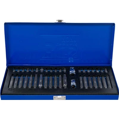 made of chrome vanadium steel in metal case 14 internal hexagon bits, short and long type 4 - 5 - 6 - 7 - 8 - 10 - 12 mm 14 T-Star bits (for Torx), short and long type T20 - T25 - T30 - T40 - T45 - T50 - T55 10 spline bits (for XZN), short and long type M5 - M6 - M8 - M10 - M12 10 mm bit adaptor with 10 mm (3/8") drive 10 mm bit adaptor with 12.5 mm (1/2") drive, Weight: 4.0124131684 pounds, Manufacturer: BGS