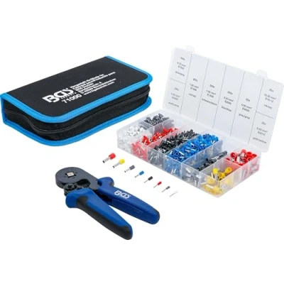 for clean and reliable crimping of cable terminals with sizes 0.25 mm² to 10 mm² self-adjusting square crimping unit distributes the pressure evenly on 4 sides | exact achievement of defined crimping forces due to integrated positive locking device parallel crimping with synchronously driven crimping jaws | lateral insertion of the ferrules into the tool scope of delivery: 1 crimping pliers | 200 pcs. cable terminals, 0.50 mm², white, E0508 | 200 pcs. cable terminals 0.75 mm², grey, E7508 | 200 pcs. cable terminals 1.00 mm², red, E1008 | 250 pcs. cable terminals 1.50 mm², black E1508 250 pcs. cable terminals 2.50 mm², blue, E2508 | 50 pcs. cable terminals 4.00 mm², grey, E4009 | 25 pcs. cable terminals 6.00 mm², yellow, E6012 | 25 pcs. cable terminals 10.00 mm², red, E10-12 | 1 zipper bag, Weight: 1.86511073652 pounds, Manufacturer: BGS