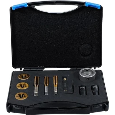 for recutting damaged threads on wheel bolts, wheel nuts and wheel hubs suitable for internal and external threads with sizes M12 x 1.25, M12 x 1.5, M14 x 1.5 | titanium (TiN) coated taps and dies scope of delivery: 1 threading die, M12 x 1.25 x 30 mm (BGS 71039-1) | 1 threading die, M12 x 1.5 x 30 mm (BGS 71039-2) | 1 threading die, M14 x 1.5 x 30 mm (BGS 71039-3) | 1 die holder, for threading dies, for BGS 71039 (BGS 71039-4) 1 tap, M12 x 1.25 (BGS 71039-8) | 1 tap, M12 x 1.5 (BGS 71039-9) | 1 tap, M14 x 1.5 (BGS 71039-7) | 1 L-type wrench 1 tap adaptor socket, with magnet, 10 mm (3/8") drive, for shaft diameter 10 mm | 1 tap adaptor socket, with magnet, 10 mm (3/8") drive, for shaft diameter 11.3 mm | 1 screwpitch gauge, 12 blades, metric 0.5 - 1.75 mm (BGS 71039-12), Manufacturer: BGS