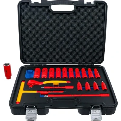 excellent tool combination for use in the range of electrical installations or for repair and maintenance work on hybrid and electric vehicles - equipped with insulated tools and tested according to DIN EN - IEC 60900 in a sturdy blow mould case with EPE foam tray - tool tray made from high-resistance foam - the tools are protected in the hard foam tray and are stowed in the recesses in a non-slip manner - each individual tool has its appropriate place material: chrome vanadium steel - DIN ISO: EN 60900 - output profile: Pro Torque (hexagon) - drive profile: internal square - drive profile size, inch: 3 - 8" - drive profile size, metric: 10 mm - handle type: VDE insulated scope of delivery: 1 VDE socket, hexagon, 10 mm (3 - 8") drive, 7 mm - 1 VDE socket, hexagon, 10 mm (3 - 8") drive, 8 mm - 1 VDE socket, hexagon, 10 mm (3 - 8") drive, 10 mm - 1 VDE socket, hexagon, 10 mm (3 - 8") drive, 11 mm - 1 VDE socket, hexagon, 10 mm (3 - 8") drive, 12 mm - 1 VDE socket, hexagon, 10 mm (3 - 8") drive, 13 mm - 1 VDE socket, hexagon, 10 mm (3 - 8") drive, 14 mm - 1 VDE socket, hexagon, 10 mm (3 - 8") drive, 15 mm - 1 VDE socket, hexagon, 10 mm (3 - 8") drive, 17 mm - 1 VDE socket, hexagon, 10 mm (3 - 8") drive, 19 mm - 1 VDE socket, hexagon, 10 mm (3 - 8") drive, 22 mm, Manufacturer: BGS