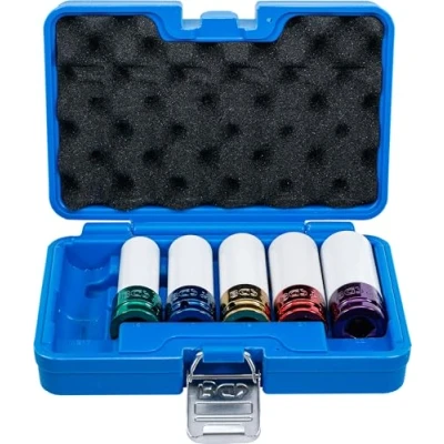 made of chrome molybdenum steel for both manual and impact wrenches can be fixed on impact wrench by pin and O-ring plastic cover and plastic sleeve for protection of aluminium rims coloured sockets help to indicate the right size includes MS17 special socket for the latest generation of Mercedes wheel nuts single sizes available under BGS 7201, 7202, 7203, 7207, 7208, 7309 spare plastic protection cover available under BGS 7204, 7205, 7206, 7209, 7198 scope of delivery: Protective Impact Socket, 12.5 mm (1/2") drive: 15 mm | Protective Impact Socket, 12.5 mm (1/2") drive: 17 mm | Protective Impact Socket, 12.5 mm (1/2") drive: 19 mm | Protective Impact Socket, 12.5 mm (1/2") drive: 21 mm | Protective Impact Socket, 12.5 mm (1/2") drive: 22 mm | MS17 special socket for Mercedes wheel nuts, 12.5 mm (1/2") drive length: 85 mm, Weight: 3.6817197754 pounds, Manufacturer: BGS