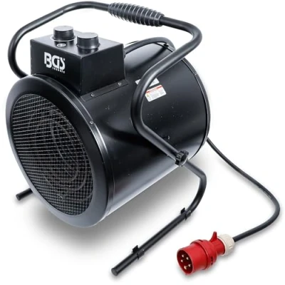 portable heat source for heating spaces such as workshops, garages, construction sites, apartments and stores | with excellent heat output for indoor and outdoor use due to the high power equipped with a connection for three-phase alternating current (three-phase current) | heating coil and powerful air flow provide fast heating over long distances with low noise level easy to transport and quickly stored due to its light weight and compact dimensions | temperature limitation with automatic reset and overheating protection 2 heating levels (4500 / 9000 W) and fan operation | clear control panel with adjustable thermostat | stable stand | swiveling heating element | powder coated housing power supply: 380 - 400 V ~3 AC 50 Hz | plug type: CEE three-phase connector according IEC 60309 | nominal heating power: 9000 W | heating power steps: 4500 / 9000 W | heater type: heating tube | air flow volume: 780 m³/h | protection class: IPX4 | recommended usable area: 80 m² | angle adjustment: 15 - 25° | cable length: 1.5 m | thermostat: mechanical / relay control system, Manufacturer: BGS