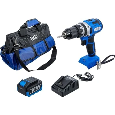 rechargeable batteries and chargers are interoperable with the BGS 18 V system - powerful, compact and cordless cordless impact drill - drilling, hammer drilling and screwing as individual preselection modes - suitable for powerful screwing and fast drilling - for drilling holes in wood, metal, plastic and other screwing applications - suitable as an impact drill for bricks and masonry - with compact head length and excellent overall tool control - powerful, brushless motor ensures maximum performance with a longer operating time compared to conventional carbon brush motors reversible clockwise - counter-clockwise rotation - 2-speed gearbox excellently tuned for excellent power transmission - 20-stage torque adjustment module with secure and reliable cut-off torque - high-quality Ø 1.5 - 13 mm quick-release drill chuck made of solid metal with centrically clamping jaws for quick tool changes - ergonomic design with soft grip and additional handle for a secure hold and comfortable handling - has a powerful LED light with high illumination power for poorly lit working areas - with practical metal belt clip can be fixed on the right or left as required bit - length 65 mm - external hexagon 6.3 mm (1 - 4") drive - cross slot PH2 - powerful lithium-ion battery - extra compact design - ensures efficient use and maximum operating time of the lithium-ion cells - rubberized base provides excellent grip when placing your machine on the workbench - with 3-stage charge level indicator - locking mechanism (locks the battery in the tool) - suitable for BGS 18 V system battery packs - for short charging times - with LED charging indicator - housing made of impact-resistant plastic - universal tool bag suitable for storage and transport of cordless, hand and power tools lightweight - with 10 external compartments, some of which can be closed, 8 internal compartments, 1 extra-large main compartment and 2 carrying handles - wide-opening top opening for easy access - removable carrying - shoulder strap with shoulder pad for easy transportation - reinforced, splash-proof at the basement with 4 protective pads - material: nylon 1680D - input voltage: 220 - 240 V AC - 50 Hz - input power: 105 W - output voltage: 21 V - charging current: 4.0 A - charging temperature: -10 - 50 °C - protection class: II - power cord length: 1750 mm - accumulator type: Li-ion - nominal voltage: 18 V - accumulator power (electric charge): 4 Ah, Weight: 8.38638444648 Pounds, Manufacturer: BGS