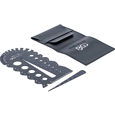 useful helper that should not be missing in any toolbox | for fast and accurate determination of dimensions of screws, bolts, drills, washers and other round materials multifunctional tool in manageable size and flat card format | for use in the workshop for vehicle repairs where corresponding sizes must be determined exactly thread size on screws and bolts: no. 5 - 6 - 8 - 10 - 12 and 1/4 - 5/16 - 3/8 - 7/16 - 1/2 - 9/16 - 5/8 - 3/4" | thread pitches on screws and bolts: 10 - 11 - 12 - 13 - 14 - 16 - 18 - 20 - 24 - 32 - 40 diameter of drills: 0.024 - 0.03 - 0.035 - 0.025 - 0.0312 - 0.0375 - 0.05 - 0.0625 - 0.078 - 0.109 - 0.125 - 0.14 - 0.172 - 0.1875 - 0.203 - 0.234 - 0.25" | inner diameter of holes and outer diameter of round materials: 1/64 - 1/8-3/16 - 1/4 - 5/16 - 3/8 - 7/16 - 1/2" (1/64" subdivision) measurement of lengths: 1/32" - 2" | angle measurement: 60 - 90 - 118 - 135°, Weight: 0.41005980732 Pounds, Manufacturer: BGS