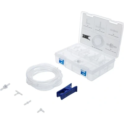 for repairing hoses on windshield washer systems replace defective areas in wiper water tubes quickly and easily ideal for historic vehicles, can also be used on newer vehicle models plug-in connections | no hose clamps required scope of delivery: 1 PVC hose, 4 m, transparent, for 4.8 mm (3/16") connectors | 5 angle connectors, 90°, 4.8 mm (3/16") | 5 straight connectors, 4.8 mm (3/16") | 5 T-type connectors, 4.8 mm (3/16") | 2 one-way valves, 4.8 mm (3/16") | 1 hose cutter
