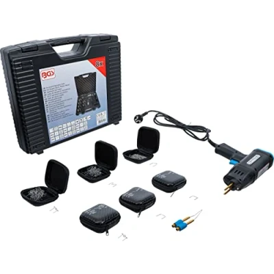 for reinforcing and repairing plastic parts such as cracks and/or fractures on surfaces, housing parts, inner corners and outer corners | in a short time, a component is thus repaired in a dimensionally stable manner and prepared for further processing such as painting or filling LED lighting with high brightness to illuminate the work area | 3 different heating modes | built-in microprocessor | LED's provide information about the operating status such as power supply, overheating, short circuit or open circuit overheating protection and built-in acoustic warning signal | extremely light and easy to use gun body | heating staples with predetermined breaking point, a pair of pliers or side cutters is not required to shorten the staple protrusion | heating rod holder for different repair staple diameters incl. soldering attachment for heating and welding of plastics | input voltage: 100 - 240 V (50 - 60 Hz) | power: 75 W | housing material: polyamide (PA) glass fiber reinforced scope of delivery: 1 hot stabler, with solderung attachment | 50 repair staples, for outside corners, 0.6 mm (BGS 73348) | 50 repair staples, for inside corners, 0.8 mm (BGS 73349) | 50 repair staples, flat, 0.6 mm (BGS 73350) | 50 repair staples, flat, 0.8 mm (BGS 73351) | 50 repair staples, wave shape, 0.6 mm (BGS 73352) | 50 repair staples, wave shape, 0.8 mm (BGS 73353), Weight: 4.79064495326 pounds, Manufacturer: BGS