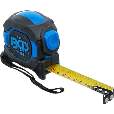 high-quality measuring tape with composite plastic housing | yellow coated and abrasion-proof coated steel strip | flexible and bend-proof metric scale on both sides | mm classification on upper and lower ends | scale division in black | decimal places marked in red | can be read both horizontally and vertically with automatic tape intake, magnetic stop and locking function | double riveted, movable end hook for easy internal and external measurement | in a sturdy 2-component housing made of ABS plastic non-slip contact surface for a secure grip | with practical metal belt clip | incl. loop for holding and hanging up accuracy class: II | measuring range: 8 m | tape width: 25 mm, Manufacturer: BGS
