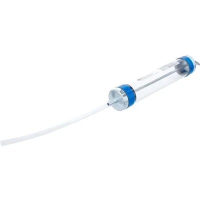 for extracting and transferring various liquids as well as applications in the sanitary sector suitable for engine, transmission, rear axle and hydraulic oils, antifreeze and other non-corrosive fluids transparent housing design for liquid level check | with practical T-handle shape | not suitable for acids and highly flammable liquids housing material: polystyrene (PS), aluminum, blue | tank capacity: 500 ml | pump housing length: 300 mm pump housing diameter: 60 mm | internal hose diameter: 8 mm | external hose diameter: 12 mm