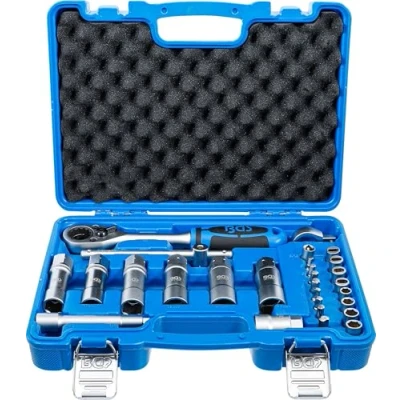 for professional maintenance work on suspension struts such as shock absorbers, suspension strut bearings, coil suspension springs for any repair work on shock absorbers and for counterholding the shock absorber piston | for the most common vehicle types it is essential to observe the torque tightening values of the vehicle manufacturer | material: chrome-vanadium-steel scope of delivery: 1 push-through Ratchet, 12-point 21 mm | 6 sockets, hexagon, deep, 12.5 mm (1/2") drive and external hexagon 21 mm, 16 - 17 - 18 - 19 - 21 - 22 mm | 1 sliding bar, external square 10 mm (3/8") | 4 sockets, special profile (oval), 6.3 mm (1/4") drive, 5 - 6 - 7 - 7.5 mm | 4 sockets, hexagon, 6.3 mm (1/4") drive, 8 - 9 - 10 - 11 mm 4 bits, external hexagon 8 mm (5/16"), internal hexagon 5 - 6 - 7 - 8 mm | 4 spreader sockets for spring strut clamps, 6.3 mm (1/4") drive, 10 - 11 - 12 - 13 mm | 1 extension bar, 10 mm (3/8") drive, external square 6.3 mm (1/4") | 1 socket, hexagon, 12.5 mm (1/2") drive and external hexagon 21 mm, 22 mm | 1 adaptor, 6.3 mm (1/4") drive to internal hexagon 8 mm (5/16") | 1 push fit ring spanner, 21 mm, square size 9 x 12 mm, Weight: 6.2611282408 pounds, Manufacturer: BGS