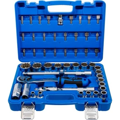 extensively equipped for demanding mechanics as well as do-it-yourselfers | with 12-point sockets in short version and bits with different output profiles | high-quality fine-tooth reversible ratchet with 90 teeth, inserted reversible lever, ergonomic two-component handle and quick-release button for fast tool changes | contains among other things further diverse operating elements such as extension bars, sliding handle and universal joint for covering various screwing applications, even in hard-to-reach areas | safe and tidy storage in blow mold case | clear arrangement of the various sockets and bit inserts for quickly finding the required size | with knurling | sockets, extension bars, reversible ratchet, universal joint and bit adptor made of chrome vanadium steel | bits made of high quality chrome vanadium steel (S2) | drive profile: internal square | drive profile size, metric: 12.5 mm | drive profile size, inch: 1/2" | of teeth in ratchet head: 90 | handle type: 2 component handle | material: chrome vanadium steel | surface finish: satin chrome plated scope of delivery: 20 sockets, 12-point, 12.5 mm (1/2") drive: 8 mm (BGS 10628) - 9 mm (BGS 10629) - 10 mm (BGS 10630) - 11 mm (BGS 10631) - 12 mm (BGS 10632) - 13 mm (BGS 10633) - 14 mm (BGS 10634) - 15 mm (BGS 10635) - 16 mm (BGS 10636) - 17 mm (BGS 10637) - 18 mm (BGS 10638) - 19 mm (BGS 10639) - 20 mm (BGS 10640) - 21 mm (BGS 10641) - 22 mm (BGS 10642) - 23 mm (BGS 10643) - 24 mm (BGS 10644) - 27 mm (BGS 10645) - 30 mm (BGS 10646) - 32 mm (BGS 10647) | 2 spark plug sockets, hexagon, 12.5 mm (1/2") drive: 16 mm (BGS 2472) - 21 mm (BGS 2470) 1 sliding adaptor for extension bars, external square 12.5 mm (1/2") (BGS 289) | 1 universal joint, 12.5 mm (1/2") (BGS 251) | 1 "wobble" extension bar, 12.5 mm (1/2"), 125 mm (BGS 234) | 1 "wobble" extension bar, 12.5 mm (1/2"), 250 mm (BGS 235) | 1 reversible ratchet, fine tooth, 12.5 mm (1/2") (BGS 632) | 1 bit adaptor with retaining ball, 12.5 mm (1/2") drive, internal hexagon 8 mm (5/16") (BGS 293) | 5 bits, 8 mm (5/16") drive, internal hexagon: 7 mm (BGS 4387) - 8 mm (BGS 4388) - 10 mm (BGS 4389) - 12 mm (BGS 4390) - 14 mm (BGS 4391) 3 bits, 8 mm (5/16") drive, slot SL: 8 mm (BGS 4380) - 10 mm (BGS 4381) - 12 mm (BGS 4382) | 1 bit, 8 mm (5/16") drive, T-Star tamperproof (for Torx) T40 (BGS 4440) | 4 bits, length 30 mm, 8 mm (5/16") drive, T-Star tamperproof (for Torx) T45 (BGS 4445) - T50 (BGS 4450) - T55 (BGS 4455) - T60 (BGS 4460) | 1 bit, 8 mm (5/16") drive, T-Star tamperproof (for Torx) T70 (BGS 4458) | 2 bits, 8 mm (5/16") drive, cross slot: PH3 (BGS 4383) - PH4 (BGS 4384) | 2 bits, 8 mm (5/16") drive, cross slot: PZ3 (BGS 4385) - PZ4 (BGS 4386) | 6 bit, 8 mm (5/16") drive, T-Star (for Torx): T40 (BGS 8164) - T45 (BGS 8165) - T50 (BGS 8166) - T55 (BGS 8168) - T60 (BGS 4456) - T70 (BGS 4457), Weight: 9.73120424468 pounds, Manufacturer: BGS
