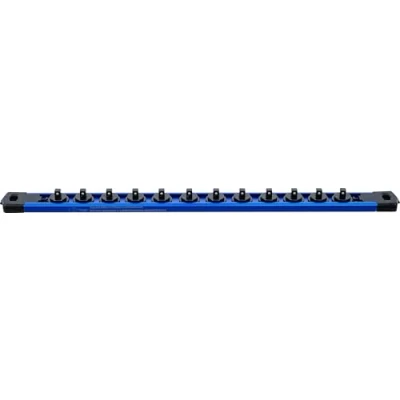 suitable for sockets with 6.3 mm (1/4") drive | 12 external square drive matching the size of the drive profile with secure plastic socket holder magnetic bottom side ensures hold on all ferrous surfaces, on workshop trolleys, storage system combinations, machines, lifting platforms and in metal drawers additional holes at each end of the bracket for wall installation material: aluminum / plastic | width: 28 mm | height: 20 mm | length: 420 mm, Manufacturer: BGS