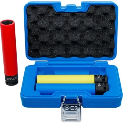 Suitable for manual and impact guns | with adapter for locking pin and rubber ring | cover and plastic insert for protection of aluminium rims Colour coded for easier finding the desired size | extra long design ensures sufficient distance to the mudguard | safe and tidy storage in plastic case inlet profile: inner square | inlet profile size, metric: 12.5 mm | inlet profile size, in inches: 1/2" output: hexagon | length: 150 mm | material: chrome-molybdenum steel Box contents: 1 x impact socket with plastic protector, extra long, 12.5 mm (1/2"), 17 mm | 1 impact socket with plastic protector, extra long, 12.5 mm (1/2"), 19 mm | 1 impact socket with plastic protector, extra long, 12.5 mm (1/2"), 21 mm In, Manufacturer: BGS