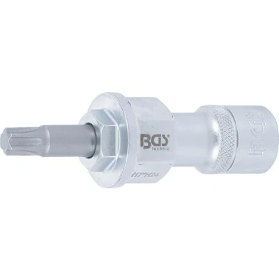for counterholding and loosening the freewheel pulley on alternators - extra short design, therefore it is not necessary to disassemble the alternator suitable for following vehicle models: Ford Transit Custom, Ecosport, Kuga, Transit Connect, Transit, Mondeo, Focus, Galaxy, S-Max, C-Max, Edge, Puma to be used as OEM 414-009, 414-009 - 1, 414-009 - 2 - socket made of chrome vanadium steel - bit made of high quality chrome vanadium steel (S2) drive profile: internal square - drive profile size, metric: 12.5 mm - drive profile size, inch: 1 - 2" - surface finish: satin chrome plated - output profile: T-Star (for Torx) - output profile size: T50 - length: 93 mm, Manufacturer: BGS