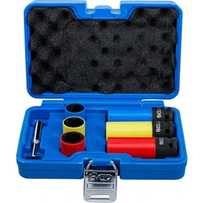 for quick and easy loosening and dismantling of wheel bolts, wheel nuts and various rim locks in connection with the screw extractor attachments in different sizes suitable for loosening and unscrewing of stuck bolts and nuts with damaged, "round turned" threads or heads screw extractors with tapered cutting edges | extra thin-walled for use on alloy rims and light alloy wheels | plastic protective sleeve prevents major damage to alloy rims | impact sockets color-coded for easy location of the desired size | punching tool for removing damaged screws from the screw extractor drive profile: internal square | drive profile size, metric: 12.5 mm | drive profile size, inch: 1/2" | material: chrome molybdenum steel scope of delivery: 1 protective impact socket, 12.5 mm (1/2") drive, 17 mm | 1 protective impact socket, 12.5 mm (1/2") drive, 19 mm | 1 protective impact socket, 12.5 mm (1/2") drive, 21 mm | 1 twist socket (Spiral Profile) / screw extractor, external hexagon drive 17 mm, 17 mm (BGS 7510-17) | 1 twist socket (Spiral Profile) / screw extractor, external hexagon drive 19 mm, 19 mm (BGS 7510-19) | 1 twist socket (Spiral Profile) / screw extractor, external hexagon drive 21 mm, 21 mm (BGS 7510-21) | 1 punching tool, Weight: 2.58822695588 pounds, Manufacturer: BGS