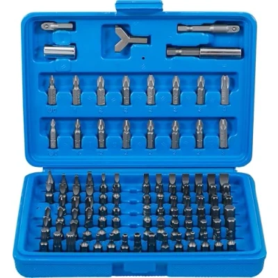 made of chrome vanadium steel 1 magnetic bit holder, 60 mm 1 hook driver bit 1 double external adaptor 6.3 mm (1/4") square x 6.3 mm (1/4") hexagon 1 bit holder 6.3 mm (1/4") drive for 6.3 mm (1/4") bits 1 bit adaptor for electric drills, 6.3 mm (1/4") hexagon shaft 95 bits slot, cross slot (PH), T-Star (for Torx), cross slot (PZ), internal hexagon, Spline (for XZN), square, for spanner, for torque, for Tri Wing, Clutch, Weight: 1.5873282864 pounds, Manufacturer: BGS technic
