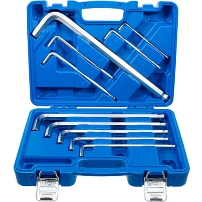 made of chrome vanadium steel | satin chrome plated forged | long side with ball point | for int hex. screws scope of delivery: L-type wrench internal hexagon: 3 mm, blade length (short side): 23 mm, blade length (long side): 130 mm | 4 mm, blade length (short side): 30 mm, blade length (long side): 145 mm | 5 mm, blade length (short side): 33 mm, blade length (long side): 165 mm 6 mm, blade length (short side): 35 mm, blade length (long side): 185 mm | 7 mm, blade length (short side): 40 mm, blade length (long side): 195 mm | 8 mm, blade length (short side): 45 mm, blade length (long side): 210 mm 10 mm, blade length (short side): 50 mm, blade length (long side): 230 mm | 12 mm, blade length (short side): 55 mm, blade length (long side): 265 mm | 14 mm, blade length (short side): 65 mm, blade length (long side): 290 mm | 17 mm, blade length (short side): 80 mm, blade length (long side): 335 mm, Weight: 5.6879263596 Pounds, Manufacturer: BGS technic KG