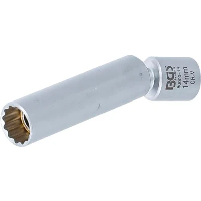 for damage-free disassembly and assembly of spark plugs and glow plugs | slim design with swivel joint suitable for use in hard-to-reach areas | with powerful magnet inside the socket for reliable holding of the spark plug drive profile: internal square | drive profile size, metric: 10 mm | drive profile size, inch: 3/8" material: chrome vanadium steel | surface finish: satin chrome plated output profile: 12-pt | wrench size: 14 mm, Manufacturer: BGS