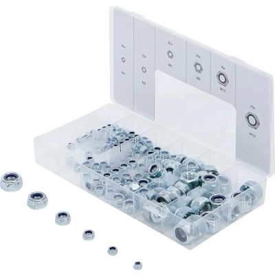 metric with nylon insert in plastic storage case 35 hexagon nuts, self-locking, M4 35 hexagon nuts, self-locking, M5 25 hexagon nuts, self-locking, M6 25 hexagon nuts, self-locking, M8 16 hexagon nuts, self-locking, M10 10 hexagon nuts, self-locking, M12 surface finish: chrome plated, Manufacturer: BGS