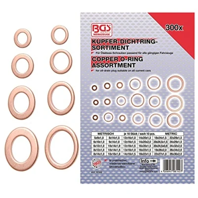 in plastic storage case scope of delivery: 10 copper sealing rings Ø 5 x 9 mm, thickness: 1.0 mm | 10 copper sealing rings Ø 6 x 10 mm, thickness: 1.0 mm | 10 copper sealing rings Ø 6 x 12 mm, thickness: 1.0 mm | 10 copper sealing rings Ø 8 x 12 mm, thickness: 1.0 mm | 10 copper sealing rings Ø 8 x 14 mm, thickness: 1.0 mm | 10 copper sealing rings Ø 8 x 14 mm, thickness: 1.5 mm | 10 copper sealing rings Ø 9 x 14 mm, thickness: 1.0 mm 10 copper sealing rings Ø 10 x 14 mm, thickness: 1.0 mm | 10 copper sealing rings Ø 10 x 14 mm, thickness: 1.5 mm | 10 copper sealing rings Ø 10 x 16 mm, thickness: 1.0 mm | 10 copper sealing rings Ø 12 x 16 mm, thickness: 1.0 mm | 10 copper sealing rings Ø 12 x 16 mm, thickness: 1.5 mm | 10 copper sealing rings Ø 12 x 18 mm, thickness: 1.5 mm | 10 copper sealing rings Ø 13 x 18 mm, thickness: 1.0 mm 10 copper sealing rings Ø 14 x 18 mm, thickness: 1.5 mm | 10 copper sealing rings Ø 14 x 20 mm, thickness: 1.5 mm | 10 copper sealing rings Ø 14 x 20 mm, thickness: 2.0 mm | 10 copper sealing rings Ø 16 x 20 mm, thickness: 1.5 mm | 10 copper sealing rings Ø 16 x 22 mm, thickness: 1.5 mm | 10 copper sealing rings Ø 18 x 22 mm, thickness: 1.5 mm | 10 copper sealing rings Ø 18 x 24 mm, thickness: 1.5 mm 10 copper sealing rings Ø 20 x 24.5 mm, thickness: 1.5 mm | 10 copper sealing rings Ø 20 x 24.5 mm, thickness: 0.8 mm | 10 copper sealing rings Ø 19 x 26 mm, thickness: 2.0 mm | 10 copper sealing rings Ø 22 x 27 mm, thickness: 1.5 mm | 10 copper sealing rings Ø 22 x 29 mm, thickness: 1.5 mm | 10 copper sealing rings Ø 24 x 29 mm, thickness: 1.5 mm | 10 copper sealing rings Ø 24 x 32 mm, thickness: 2.0 mm | 10 copper sealing rings Ø 26 x 34 mm, thickness: 2.0 mm | 10 copper sealing rings Ø 28 x 36 mm, thickness: 2.0 mm material: copper, Manufacturer: BGS
