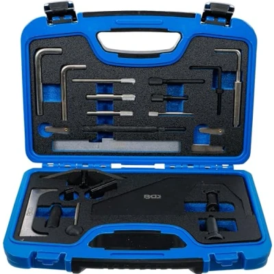 contains tools for: locking the flywheel | locking the crankshaft, camshaft, pump shaft | locking the fuel injection pump shaft extracting the crankshaft pulley | tensioning the timing belt | includes adjusting gauge for camshaft, crankshaft, pump shaft complete classification chart for vehicle types and scope of application included suitable for the following Ford engines: 1.4, 1.6 16V, 1.7, 1.8 16V, 2.0 16V (also Zetec) | 1.4, 1.6, 1.8, 1.9 D/TD/TDCi to be used as: OEM1 21-105, 21-162, 21-162B, 21-163, 21-168, 21-210, 21-251, 21-262, 21-263, 23-019, 23-020, 23-029, 23-047,23-058, 23-059, 303-1061, 303-367, 303-376, 303-393, 303-507, 303-620, 303-698, 303-734, 303-735, 310-084, 310-085 Ford | OEM2 3359, T10008, T10050, 2065A Audi | OEM3 3359, T10008, T10050, 2065A Seat | OEM4 3359, T10008, T10050, 2065A Skoda | OEM5 3359, T10008, T10050, 2065A Volkswagen | OEM6 49 JE01 061 Mazda, Manufacturer: BGS