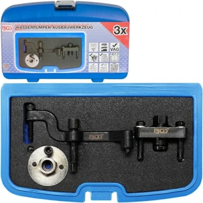 suitable for VW T5, Touareg 2.5D engine codes: AXD, AXE, BAC, BLJ, BLK, BNZ, BPD, BPC, BPE to be used as OEM1: T10225, T10221A, T10222A Audi | to be used as OEM2: T10225, T10221A, T10222A Seat | to be used as OEM3: T10225, T10221A, T10222A Skoda | to be used as OEM4: T10225, T10221A, T10222A Volkswagen scope of delivery: gear wheel puller, for disassembling of waterpump gear wheel, to be used as OEM T10222A | waterpump puller, for disassembling of waterpumps, to be used as OEM T10221A | special key, for T5 crankshafts for counterholding the crankshaft when loosening the waterpump's gear wheel screw, to be used as OEM T10225, Weight: 2.976240537 pounds, Manufacturer: BGS