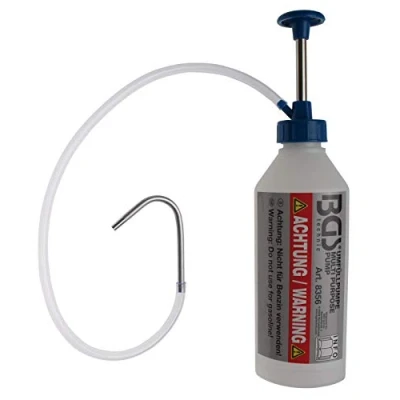 for filling and refilling liquids out of the multi purpose pump, not suitable for suction suitable for oil, brake fluid and cleaning fluid overall size 315 mm, capacity 1000 ml the pump is not suitable for gasoline and other easy flammable liquids