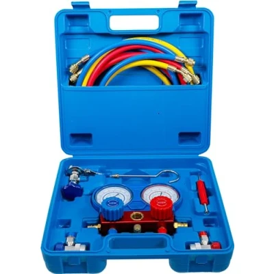 includes high- and low pressure hose and connection hose for service devices gauges are protected in an aluminum housing shut-off valves for high and low pressure if the quick couplings are not used on air pressure hoses, they can be attached to the side blind connectors for protection with hooks hose length 1.5 m suitable for R12 und R134A scale value on low pressure dial gauge: 0 to 24 bar / 0 to 350 PSI (vacuum: 10 to 30 in Hg) (-40°C to +37°C) scale value on high pressure dial gauge: 0 to 34 bar / 0 to 500 PSI (0°F to 190°F) (-10°C to + 88°C) ideal replacement item for defective gauges on service devices, can also be used for diagnosis without service devices, Manufacturer: BGS