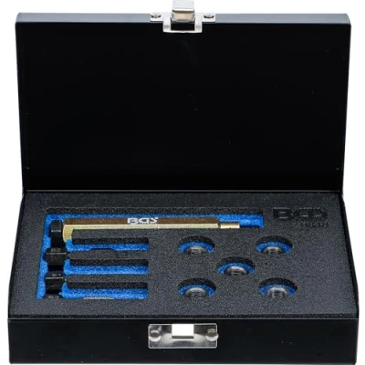 for repairing the glow plug mounting thread in the cylinder head 1 reamer for reaming the original thread 1 tap for threaded sleeves 1 tap for trimming the original thread 1 assembly tools for inserting the threaded sleeves 5 threaded sleeves, 11 mm long, internal thread M9 x 1.0 mm x external screw thread M11 x 1.0 mm, Weight: 0.1763698096 pounds, Manufacturer: BGS