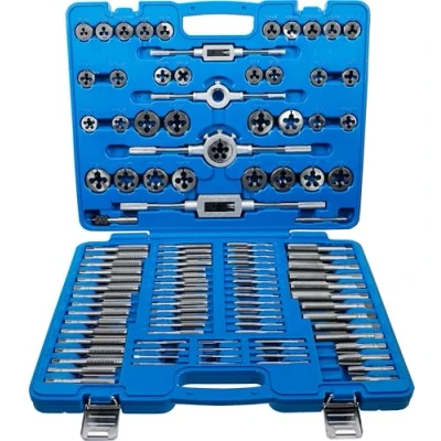 especially for fine threads 2 die holders 2 tap holders 1 T-holder for taps 35 taps (starter and plug tap for each size) and dies in follwing sizes 4"-40UNC - 6"-32UNC - 8"-32UNC - 10"-24UNC - 10"-32UNF - 12"-24UNC - 1/4"-20UNC - 1/4"-28UNF - 1/4"-24UNS - 1/4"-32UNS - 5/16"-18UNC - 5/16"-24UNF - 3/8"-16UNC - 3/8"-24UNF - 7/16"-14UNC - 7/16"-20UNF - 1/2"-13UNC - 1/2"-20UNF - 9/16"-12UNC - 9/16"-18UNF - 5/8"-11UNC - 5/8"-18UNF - 3/4"-10UNC - 3/4"-16UNF - M6 x 1.0 - M8 x 1.25 - M10 x 1.5 - M10 x 1.0 - M11 x 1.5 - M12 x 1.25 - M12 x 1.75 - M14 x 1.25 - M18 x 1.5 - 1/8"-27NP - 1/4"-18NPT material: GCr15 in a plastic case, Weight: 13.3820593034 pounds, Manufacturer: BGS technic KG