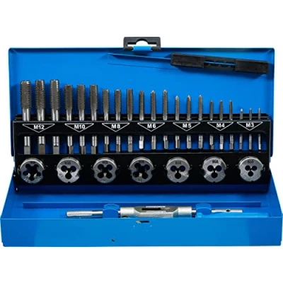 7 tap sets DIN 352 7 dies DIN 223 25 x 9 mm: M3 x 0.5 - M4 x 0.7 - M5 x 0.8 - M6 x 1.0 - M8 x 1.25 - M10 x 1.5 - M12 x 1.75 1 die holder 25 x 9 mm 1 tap wrench (DIN 1814) no. 1 1 screwpitch gauge 1 screwdriver material: GCr15 in a metal case, Weight: 3.086471668 Pounds, Manufacturer: BGS technic KG