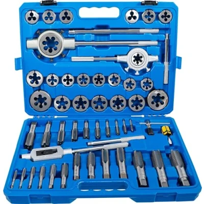 professional tap and die set to create external and internal threads - with different die holders with 3 or 5 locking screws for fixing the die adaptor for smaller dies - adjustable steel tap wrench as an operating tool for holding tools with square drive - handle can be unscrewed on one side right-hand cutting taps - individual parts are laser marked - material: alloy steel, Manufacturer: BGS
