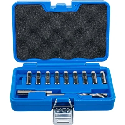 used for repairing faulty inner threads on brake calliper guide bolts in wheel bearing housings / brake calliper carriers reduces repair costs to the minimum wheel bearing housing and wheel bearing do not need to be replaced dismantling of wheel bearing, strut and a wheel alignment are not required suitable for models from VAG, Ford and Opel 1 twist drill 1 tap M10x1.25 10 calliper guide bolts, Manufacturer: BGS technic