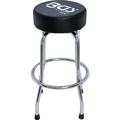suitable for the workshop and for home | robust base due to stable round tube leg shape swivel seat | footrest for comfortable sitting padded molded foam seat in leather look cover | rubberized feet for a safe stand surface finish: mirror polished | material seat: polyurethane (PU) height: 730 mm | width: 514 mm | dimensions seat surface: 365 x 365 x 75 mm | max. load capacity: 100 kg
