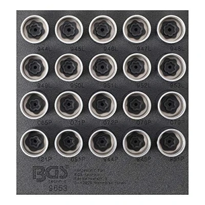 made of chrome vanadium steel for installation and dismantling of Volvo rim locks in workshop trolley tray hex drive: 19 mm length: 42,5 mm 20 rim lock sockets in sizes: #944L - #945L - #946L - #947L - #948L - #949L - #950L - #951L - #952L - #953L - #065P - #071P - #072P - #076P - #079P - #121P - #651P - #944P - #945P - #951P, Weight: 5.621787681 pounds, Manufacturer: BGS technic