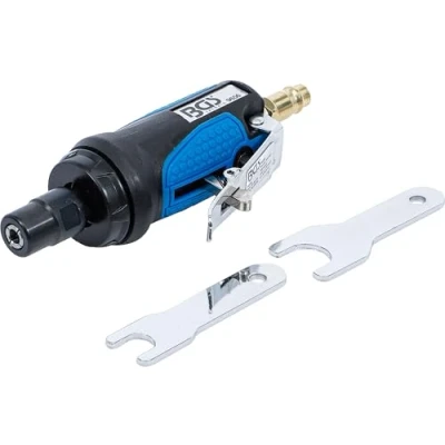 heavy and robust air die grinder for universal use - for contour grinding, cutting, polishing, shaping, deflashing and keying easy and handy to use extra short | straight type 6 mm chuck length: 120 mm | weight: 340 g compressed air inlet: 6.3 mm (1/4") working pressure: 6.2 bar idle speed: 25000 rpm air consumption: 68 l/min sound pressure level: LpA= 88 dB(A) | sound power level: LwA= 99 dB(A) | vibration level: ahd= 1.82 m/s² | K= 0.68 m/s², Weight: 1.0582188576 pounds, Manufacturer: BGS