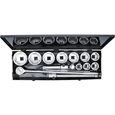 made of chrome vanadium steel in metal box reversible ratchet, external square 25 mm (1") sliding handle, drive 25 mm (1") extension bar, external/internal square 25 mm (1"), length 200 mm extension bar, external/internal square 25 mm (1"), length 450 mm sockets, 25 mm (1") drive, hexagon 36 - 41 - 46 - 50 - 55 - 60 - 65 - 70 - 75 - 80 mm surface finish: chrome plated, Weight: 46.3 Pounds, Manufacturer: BGS Do it yourself
