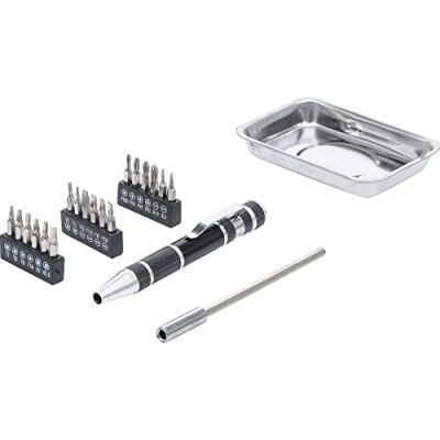 1 screw handle, magnetic, with clip, with rotating magazine at the back, length: 110 mm 1 extension, internal hexagon 4 mm drive, length: 115 mm 18 precision bits, hexagon 4 mm drive, length: 27 mm, in the magazine: bits, slot SL 1.5 - 2 - 2.5 - 3 - 3.5 - 4 mm | bits, cross slot PH 00 - 0 - 1 - 2 | bits, internal hexagon 2 - 2.5 mm | bits, T-Star (for Torx) T5 - T6 - T7 - T8 - T9 - T10 1 magnetic tray 95 x 65 x 20 mm, capacity max. 400 g, Weight: 0.4629707502 pounds, Manufacturer: BGS Do it yourself